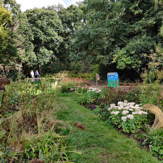 We spent a pleasant couple of hours working through the beds (and a little bit of time sheltering in the alcove). We took out weeds, thinned out dead heads, combed grasses and cut back a couple of herb species - our volunteers are now well supplied with oregano and hyssop for a good long while. As ever, our dense planting held some surprises for us - a meter tall bright yellow 'something' had hidden from our previous weeding sessions.