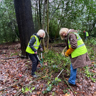 Most volunteers revisited this area to continue our habitat restoration which began 4/5 years ago and was revisited in 2023. Now, the hedges had collapsed, helped by the removal of posts by den-building enthusiasts; brambles and ivy had spread throughout the area, preventing the growth of other woodland vegetation; and, as usual, there was still a mass of holly (a highly competitive tree) which required reducing. Three hours later, a wonderful team effort left the area clearer, with a lighter woodland floor, and topped up hedges on two of the sides. (And the den building materials were now back where they started - in the hedge).